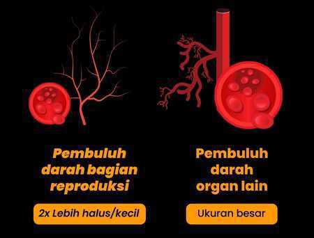 Sedangkan ukuran pembuluh darah bagian reproduksi sangatlah kecil bahkan 2x lebih kecil dari pembuluh darah besar, jika aliran pembuluh darah besar terhambat maka aliran darah ke bagian reproduksi semakin bermasalah, sehingga terjadi disfungsi ereksi